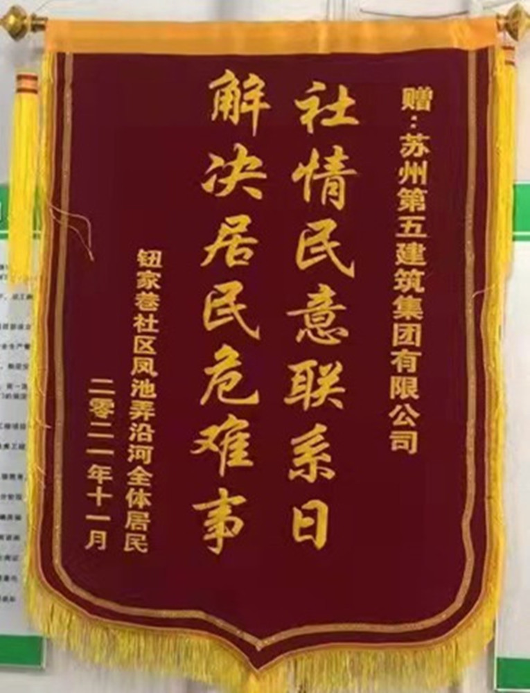 2021年10月9日,集團(tuán)公司平江路歷史街區(qū)1號(hào)地塊施工項(xiàng)目部收到了鈕家巷社區(qū)鳳池弄沿河全體居民送上的一面上書(shū)著“社情民意聯(lián)系日 解決居民危難事”的錦旗。
